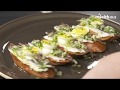 Consiste en una tosta de pan untada con tomates de penjar sobre la que se ponen anchoas en salazón y boquerones. Finalmente decorar con huevos de codorniz y una mahonesa. Programas completos en: